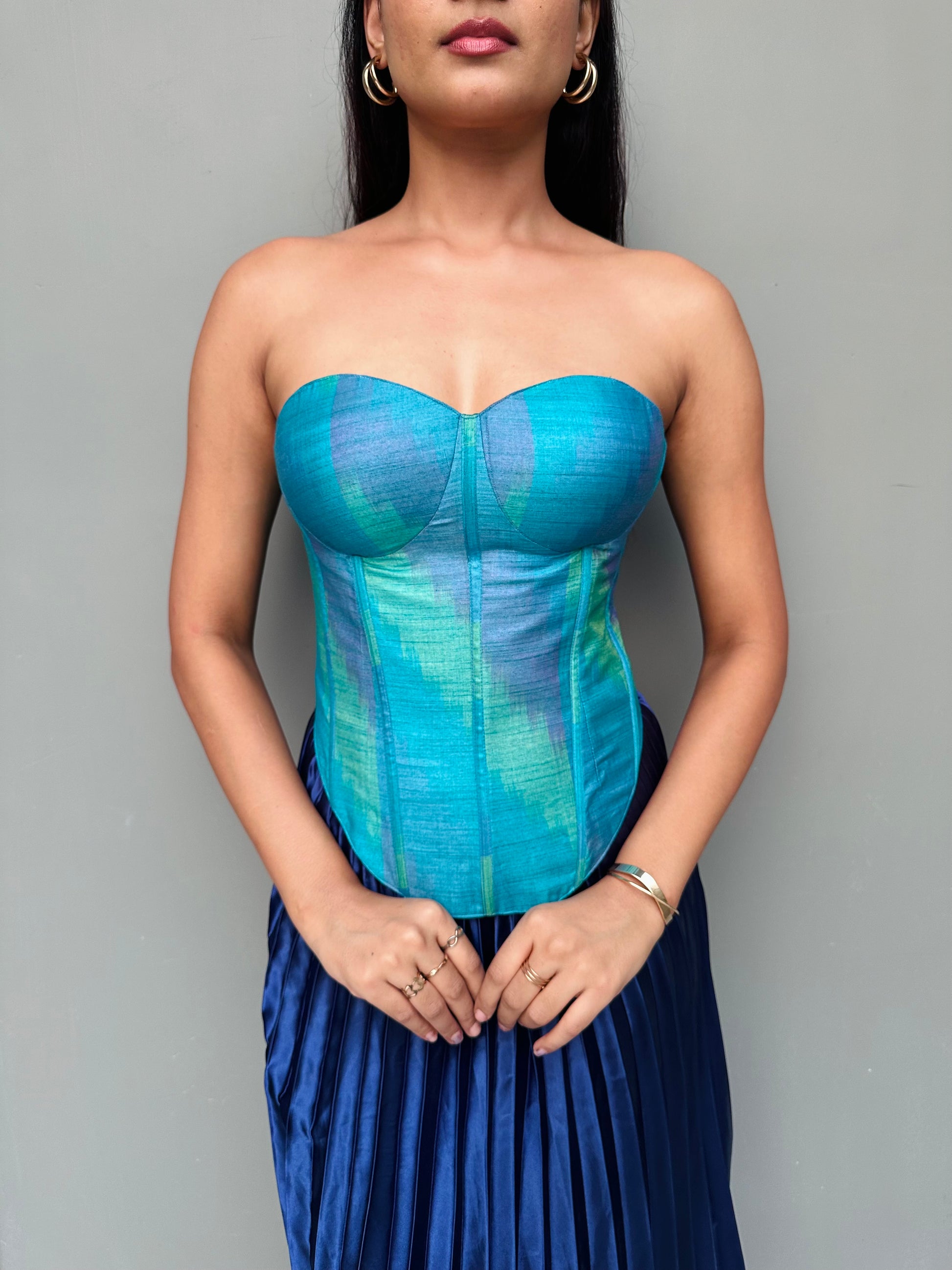 Draped in the rich, glossy texture of Bhagalpuri silk, this corset hugs in all the right places while letting your inner diva shine. Pair it with your favorite jeans, mamma's saree, a flirty skirt, or just a little confidence and watch it do its magic.